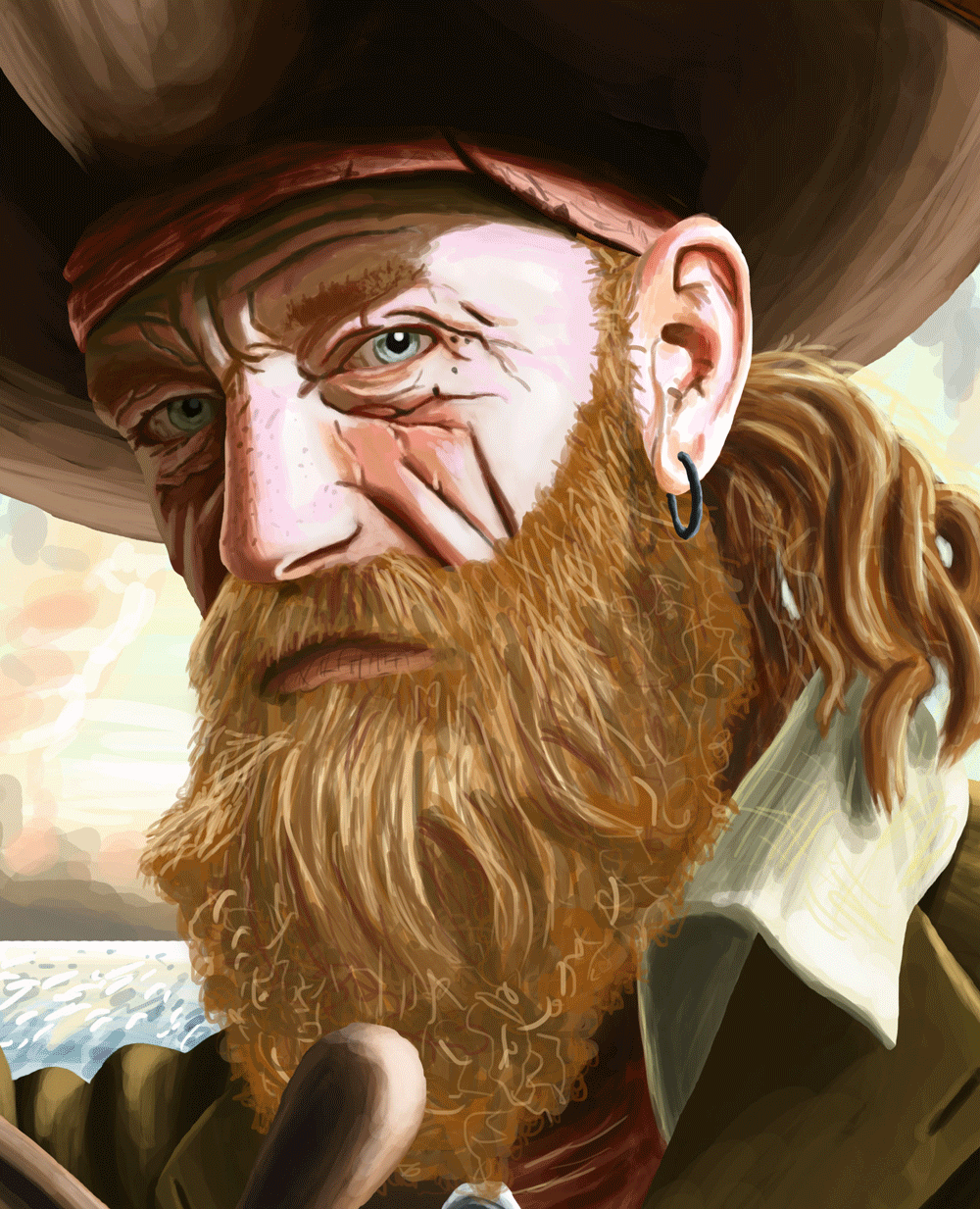 After four nights in a row of watching the four released Pirates of the Caribbean movies with the family, I of course had to do a pirate themed project…and I wanted to practice illustrating a face. I can't help but brag that this is the first time I've illustrated a face beyond a rough sketch. Generally, I have always avoided faces limiting them to an angled back facing profile. I'm really happy with how this turned out, though much of the credit I feel must go to the use of this photo. I am amazed at how the expression can be changed so drastically with minor adjustments. It's fun to see what started out as a friendly mountaineer suddenly become a hardened pirate!