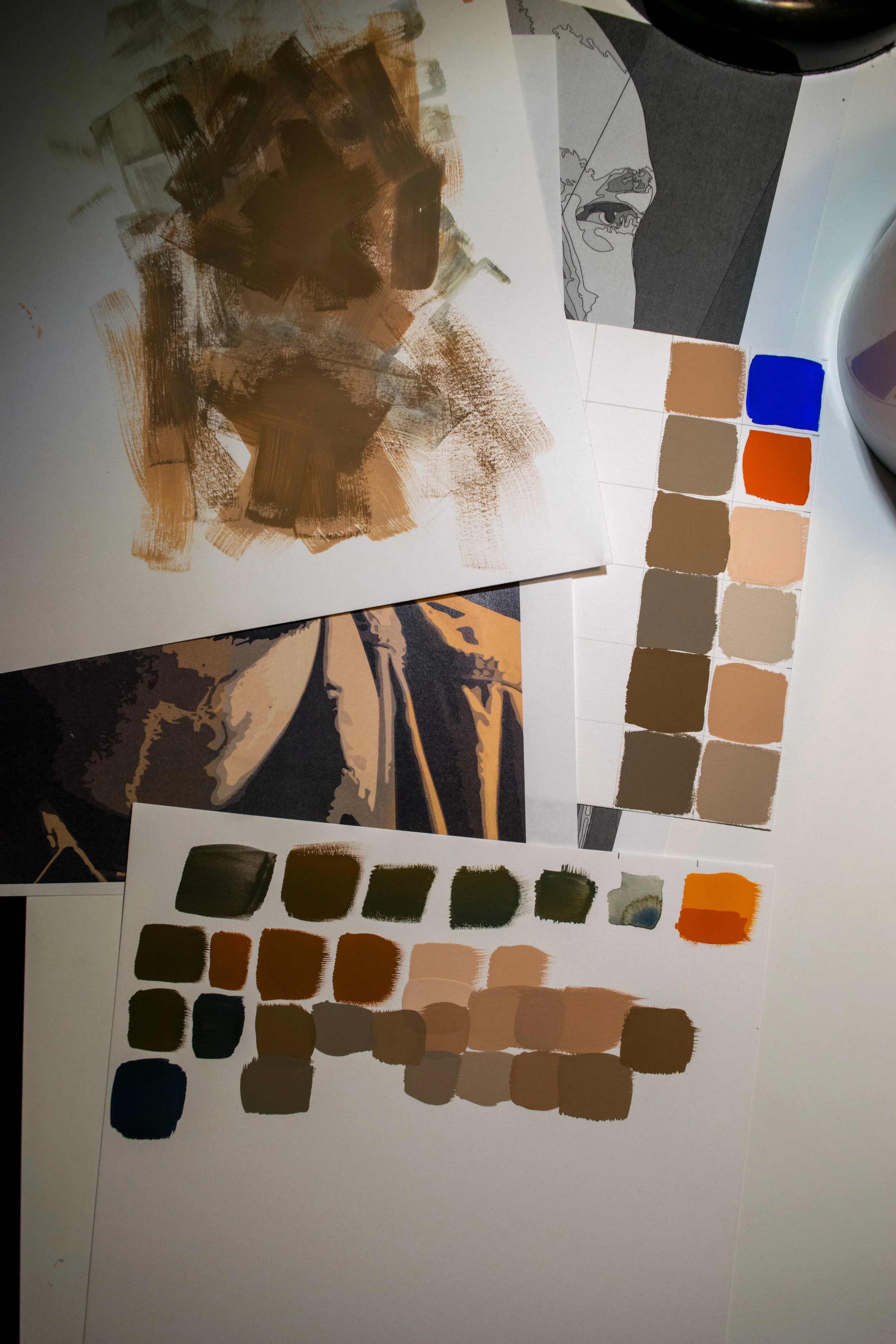 The goal was to create a muted color scheme—this is done by mixing complementary colors; I got this range of browns by mixing blue violet and yellow orange. The lights lean more toward the warmer hue while the darks toward the cooler blue. The stripe on the right has the same colors but with gray added (these are called toned colors).