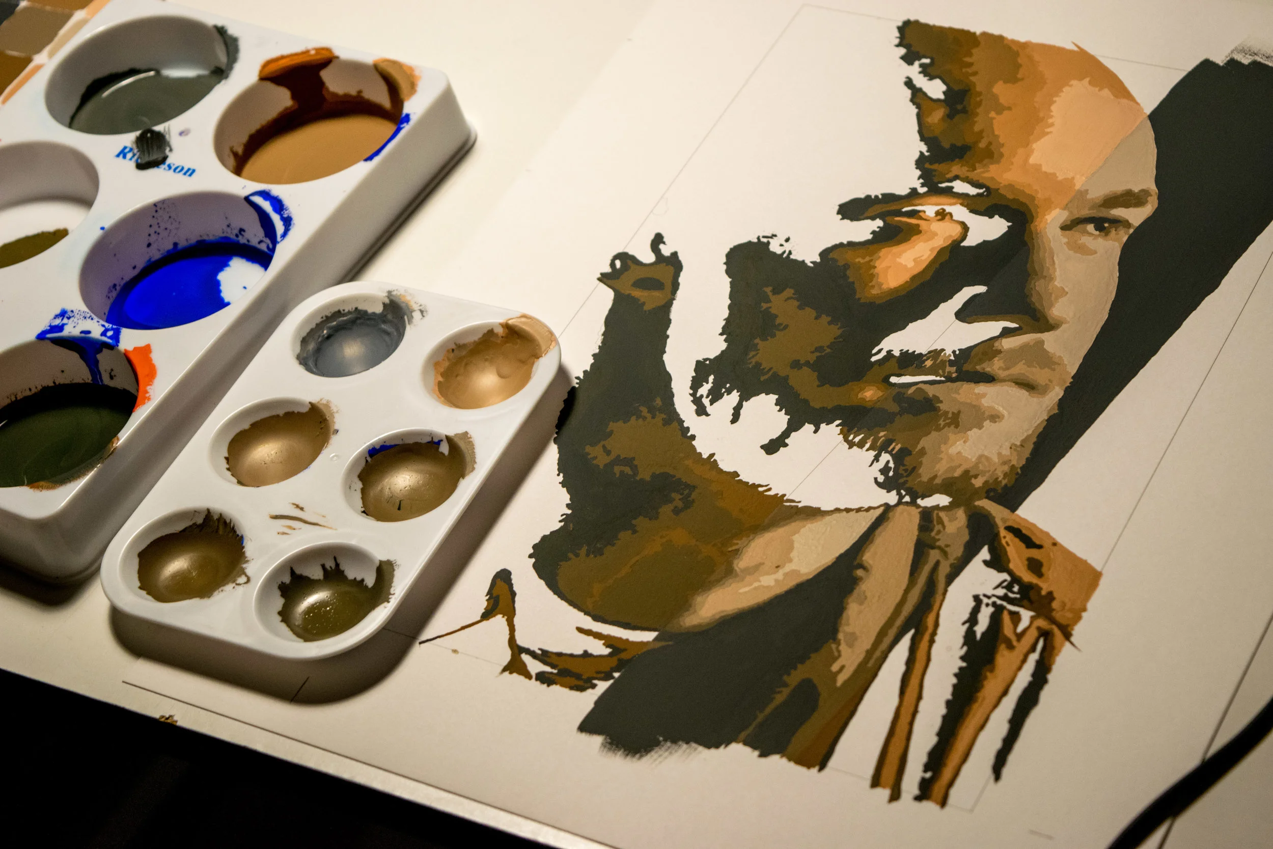 This portrait was painted with gouache on a print of a photo's vector outlines—paint-by-numbers style!