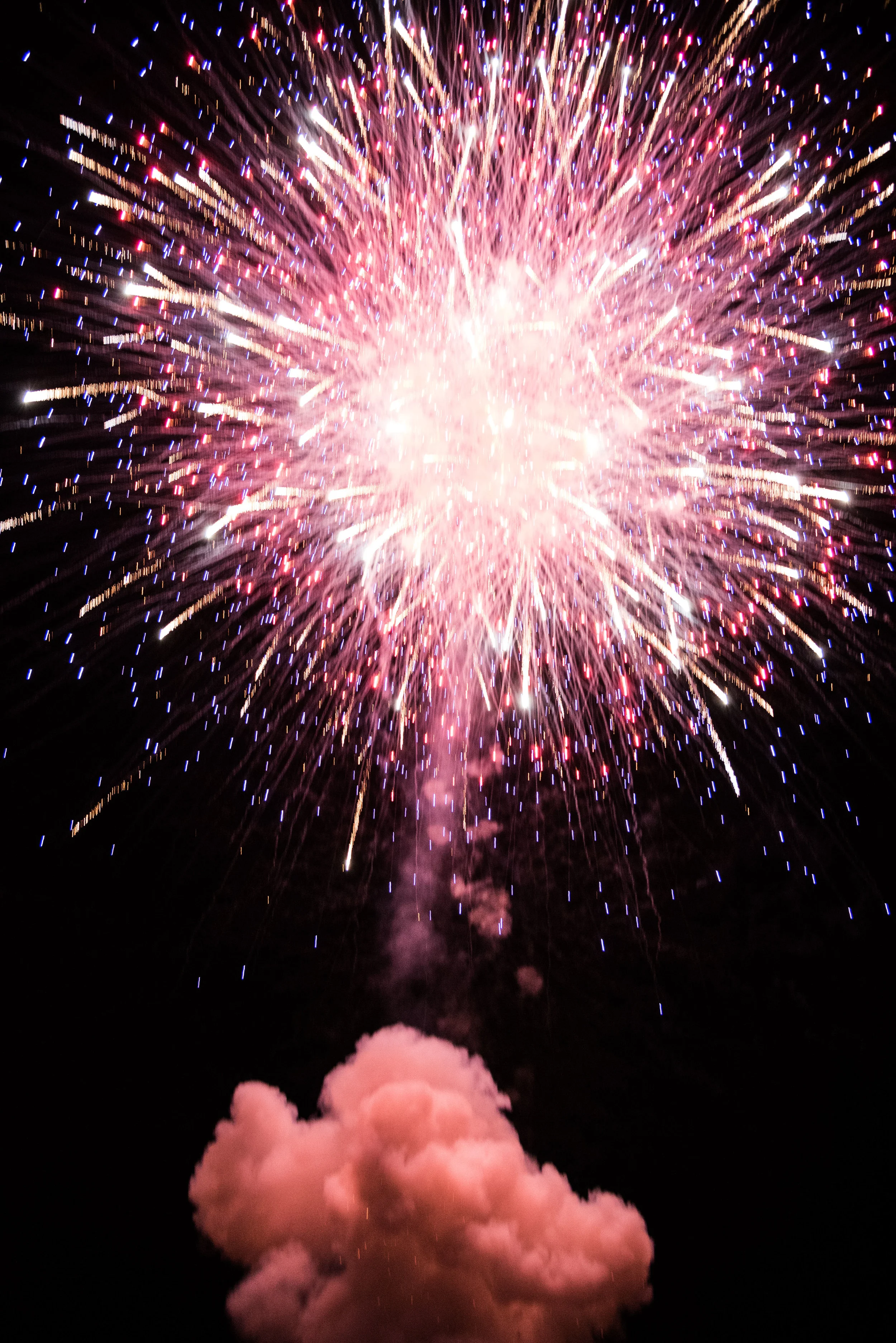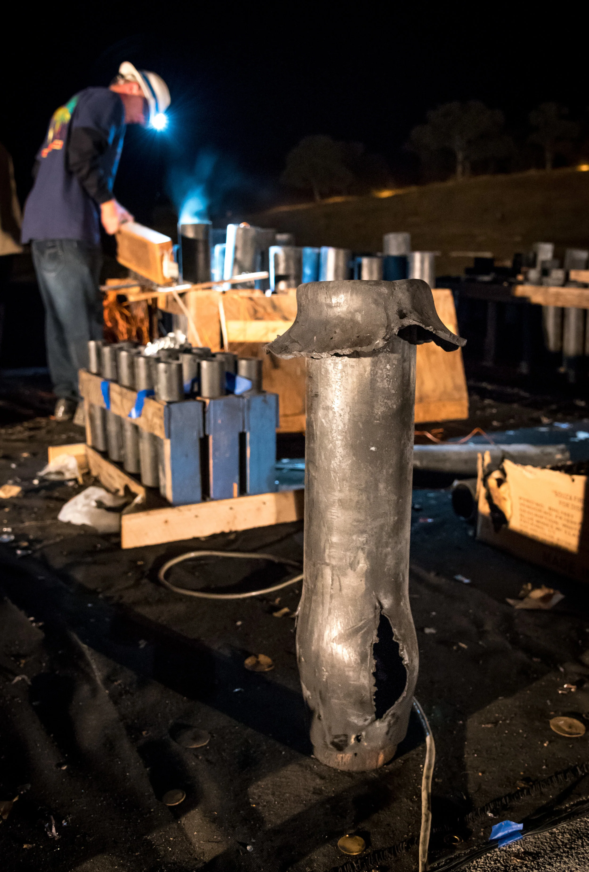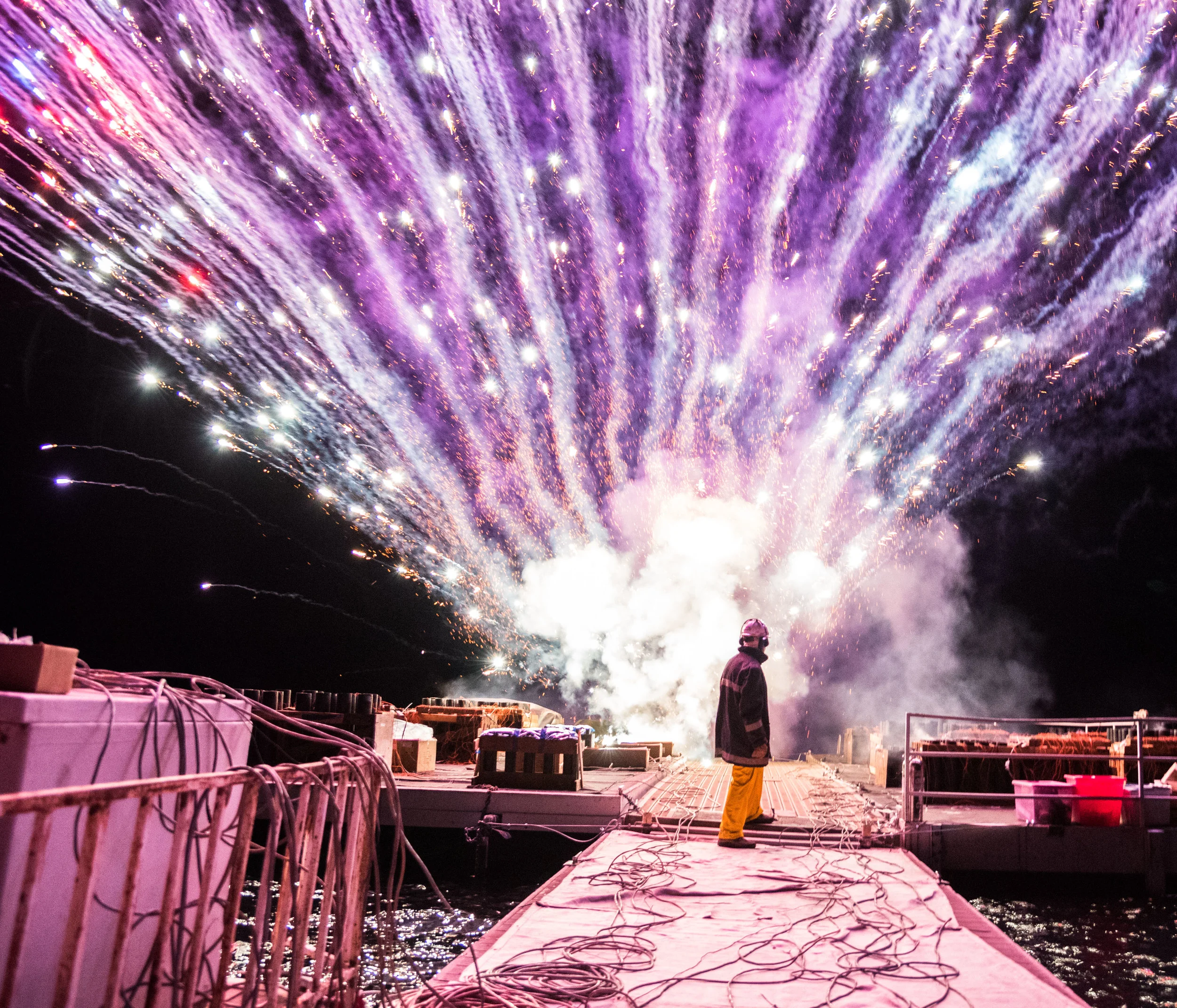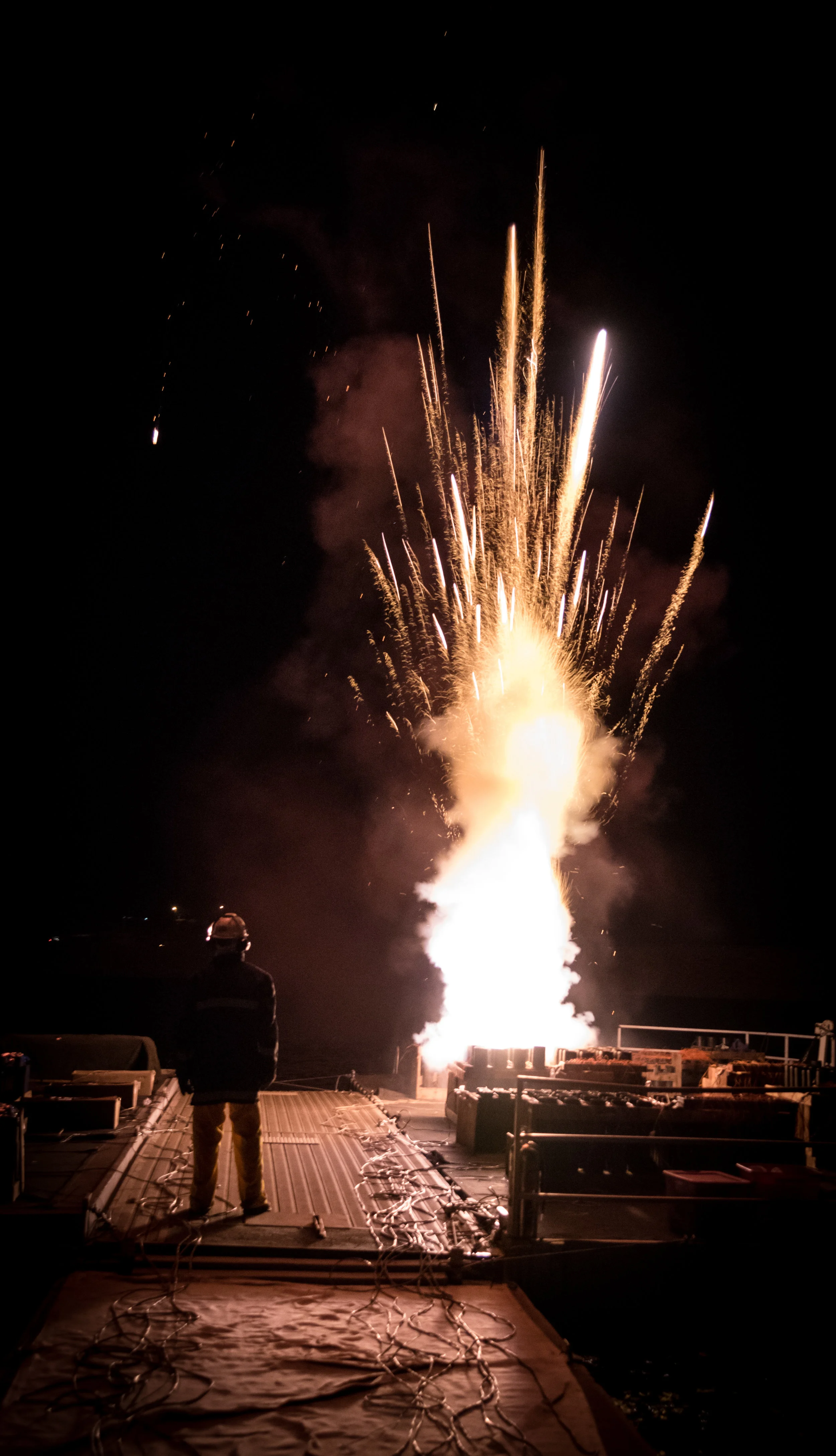 One of the fireworks didn't go off correctly—it never left its mortar blowing up at the base of its tube. In the images above, you can see the result of this sending other mortars into the air. It pushed and damaged its neighboring mortar tubes. However this went without notice and there were no major incidents. There was one that fired horizontally but away from us and any crowds.