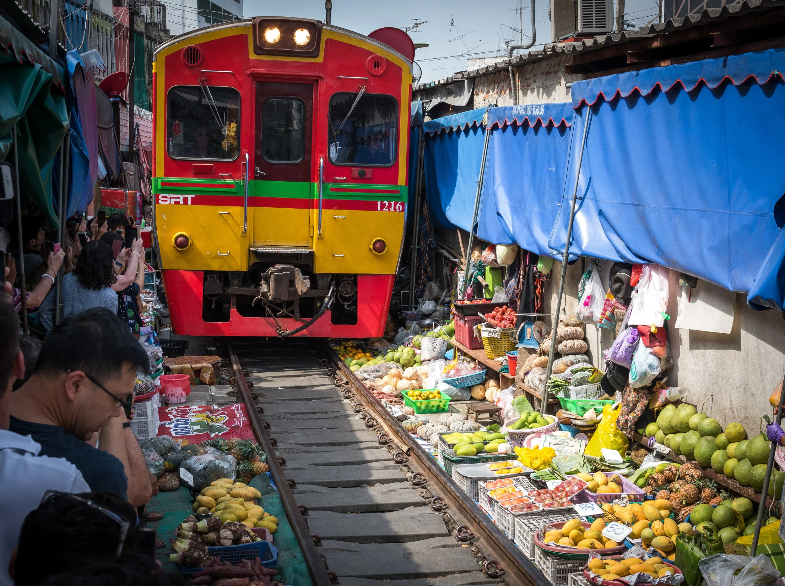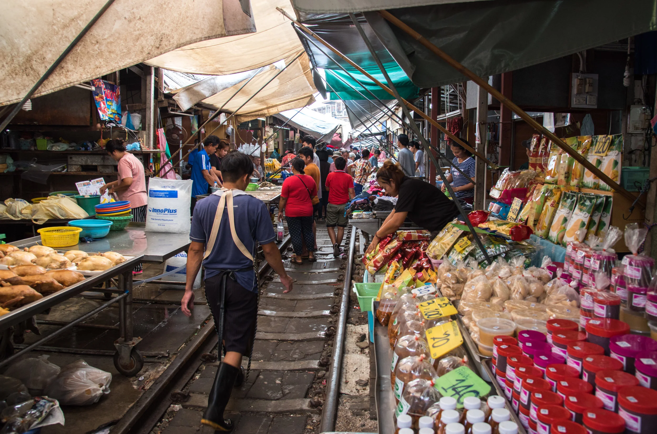 Checking out of the hostel, the famous train market was only a block away. With umbrellas, awnings, goods spread out, and feet shuffling through—the train tracks where almost hidden. Our narrow path through the dense market was between the rails. An assortment of fish, fruit, vegetables, clothing, and more where set up against our feet.